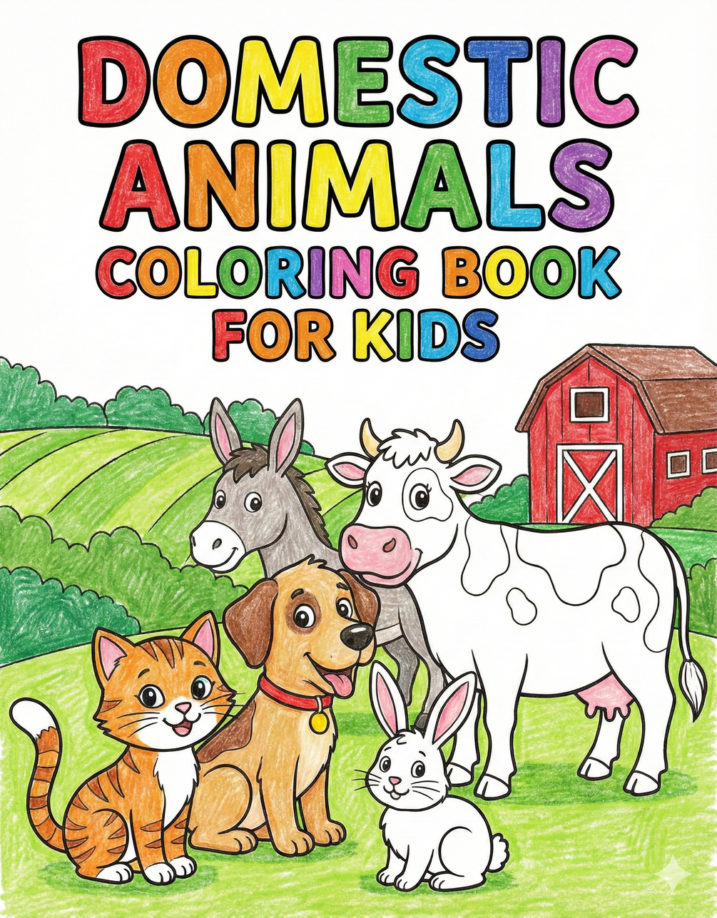 The Domestic Animals Coloring Book for Kids is a simple, engaging, and educational coloring book designed to spark creativity and help children recognize common animals they see every day.